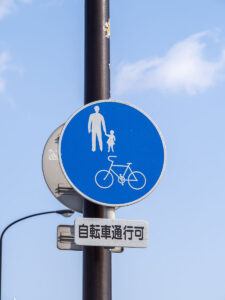 歩道を通行する時は、道路標識等により自転車が通行すべき部分として指定された部分がある場合はその部分を、指定されていない場合は歩道の中央から車道寄りの部分をすぐに止まれる速度で通行しましょう。