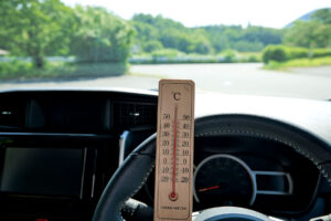 車内温度は25度くらいが適温とされていますが、炎天下の駐車車両の車内温度は70度、ダッシュボード上は80度にも達します。
